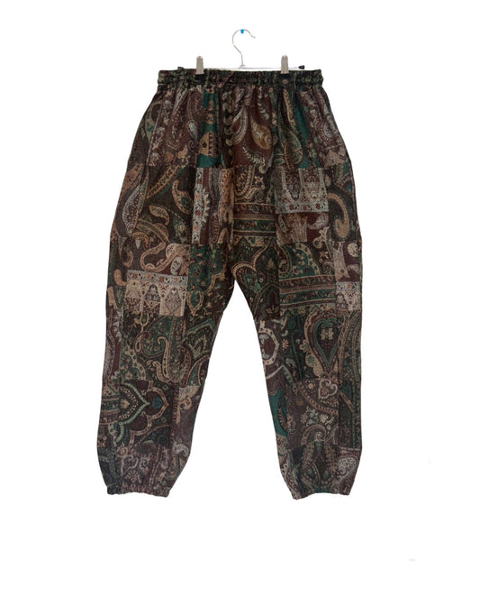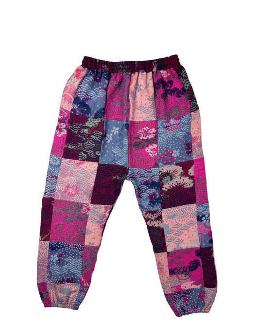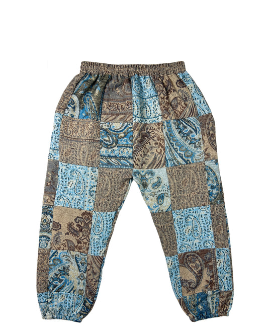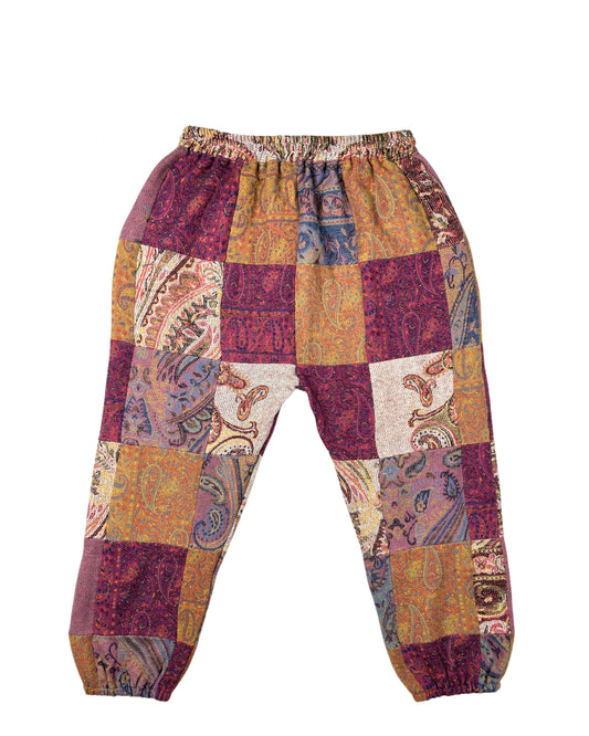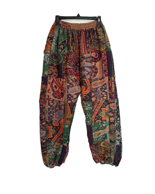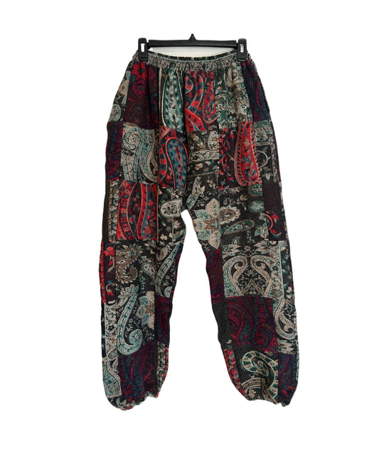 Cozy patchwork harem pants made with flannel/fleece-like material.