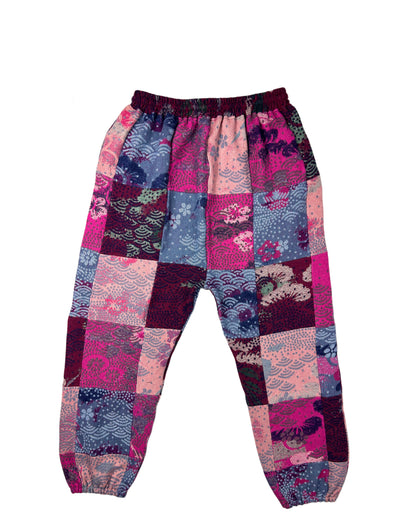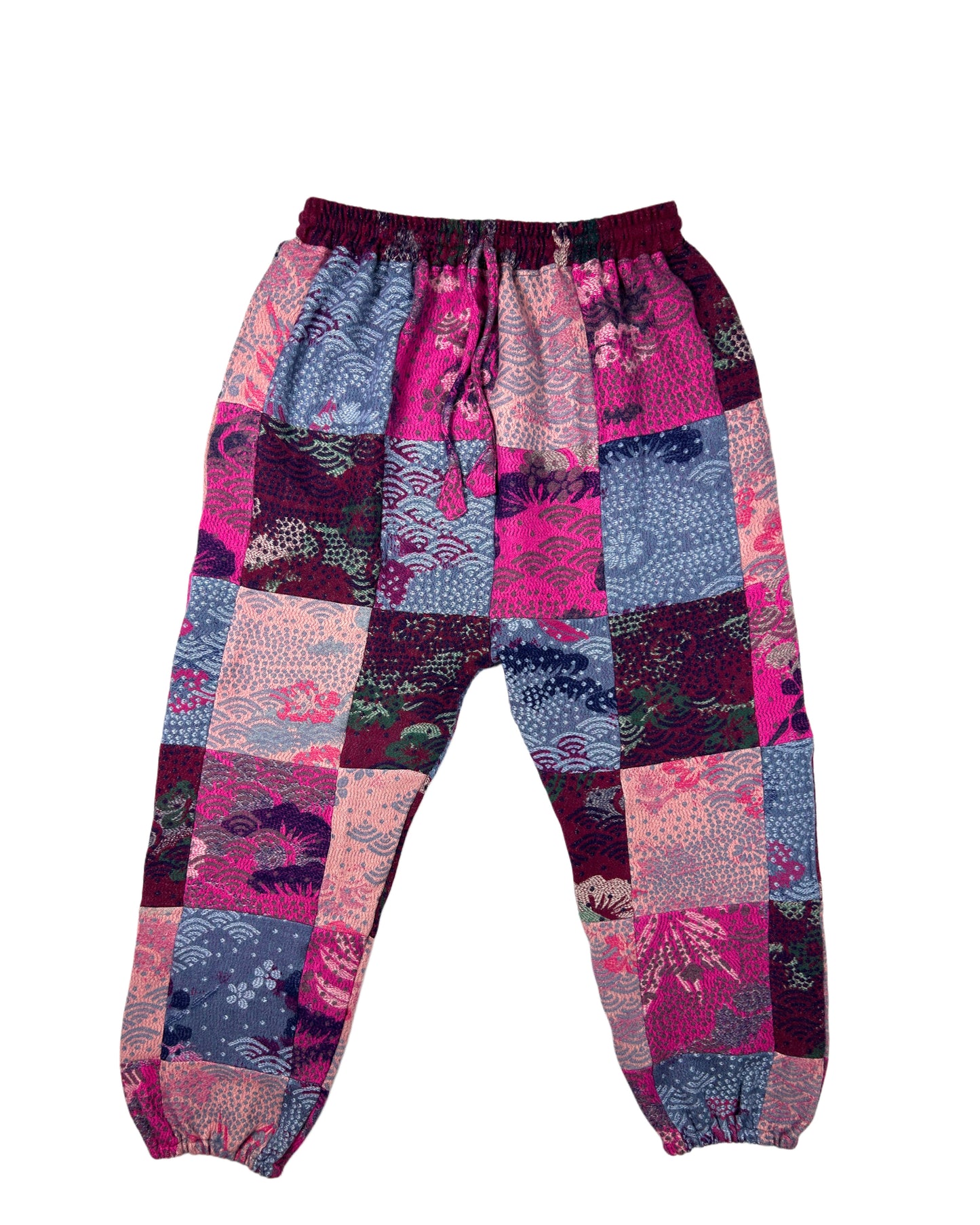 - Unisex patchwork harem pants made of thick fleece-like material.