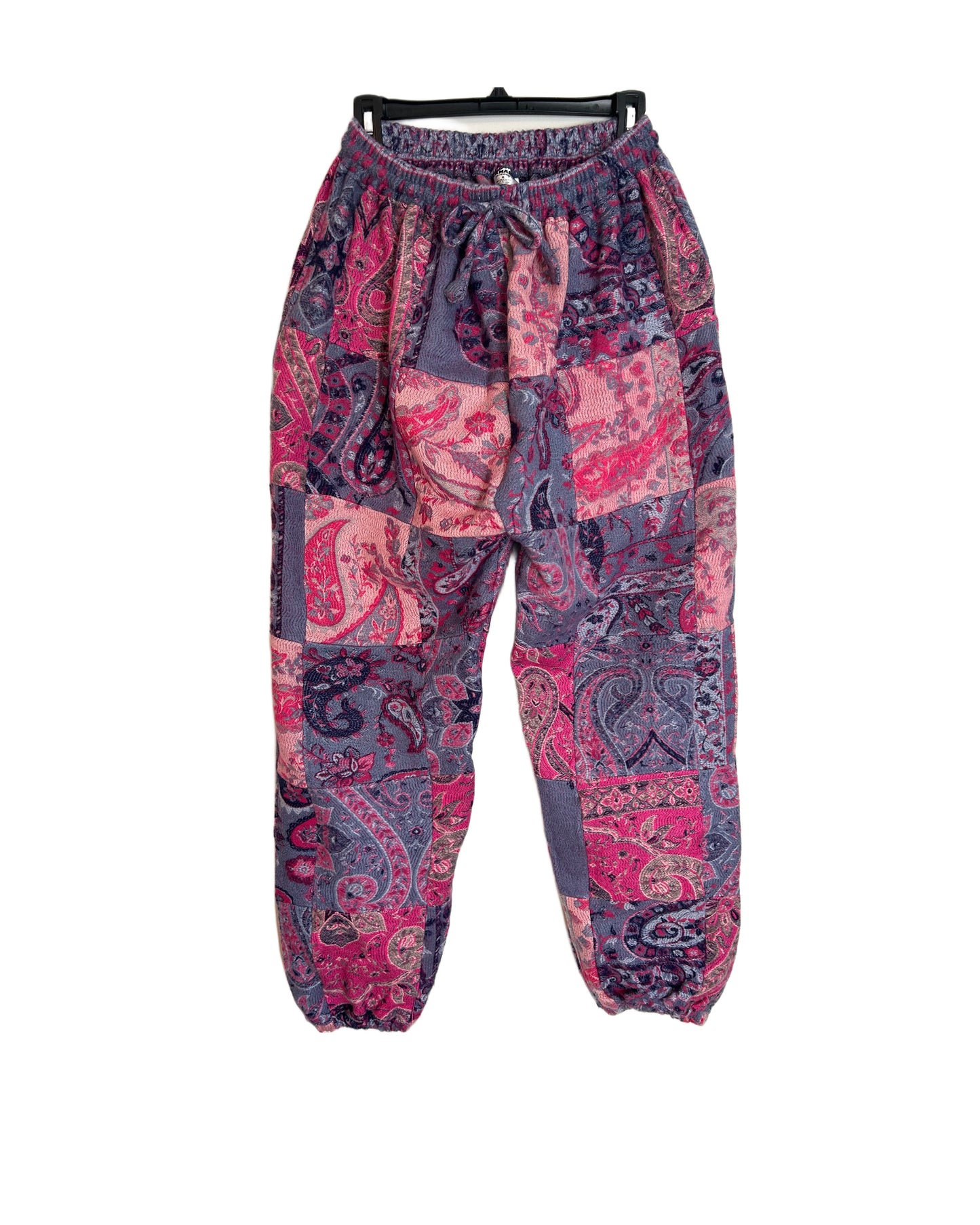 - Unisex patchwork harem pants made of thick fleece-like material.