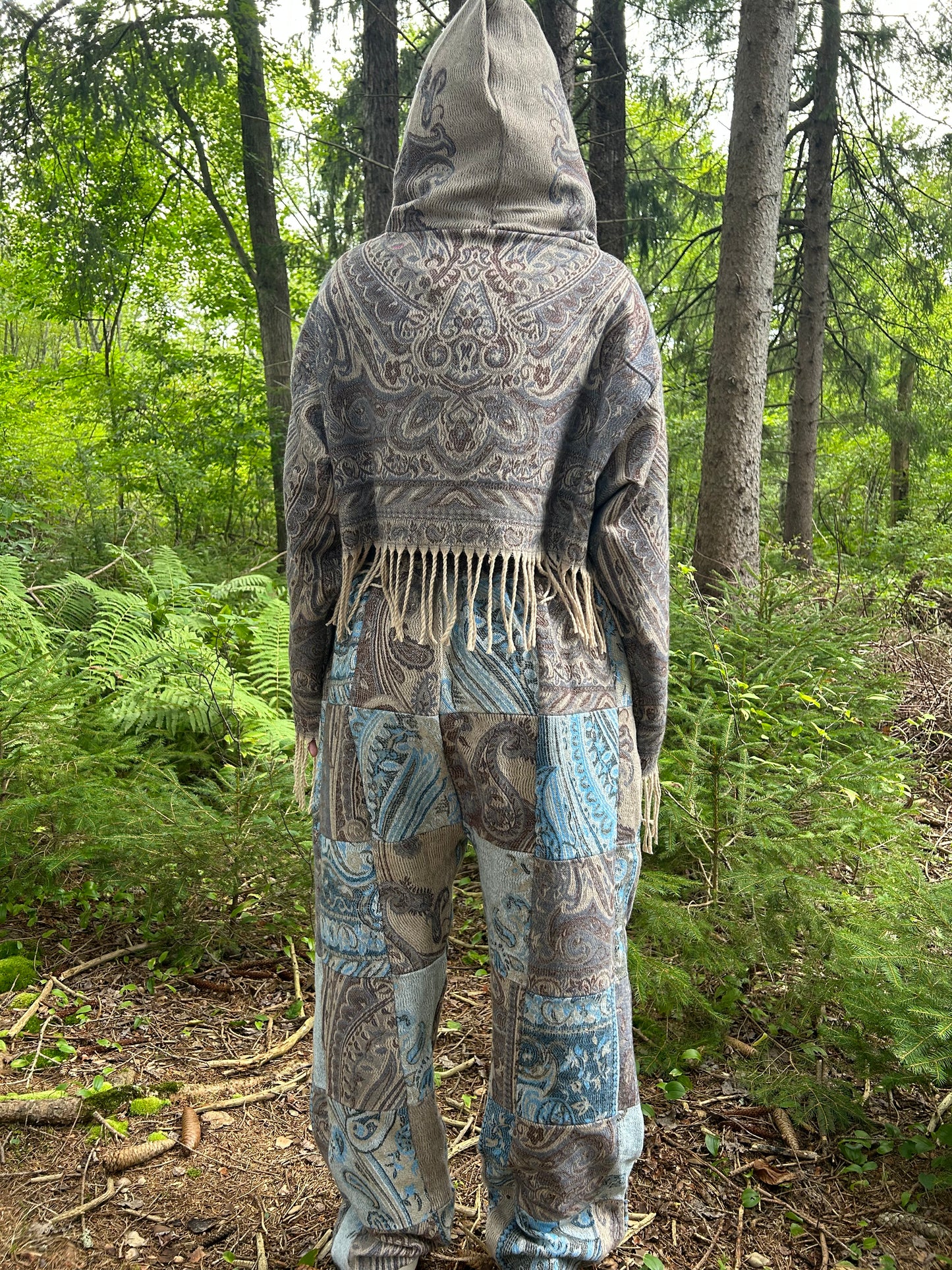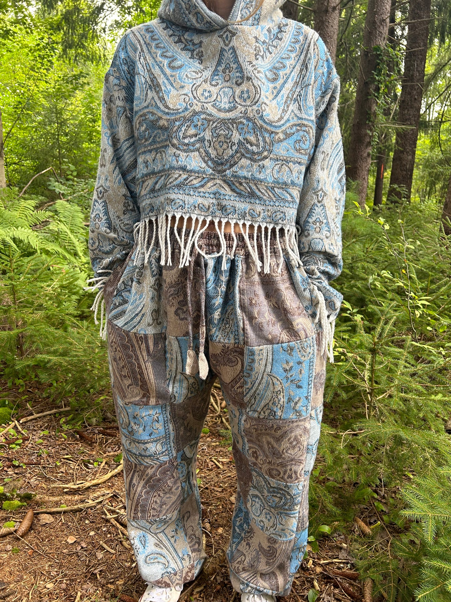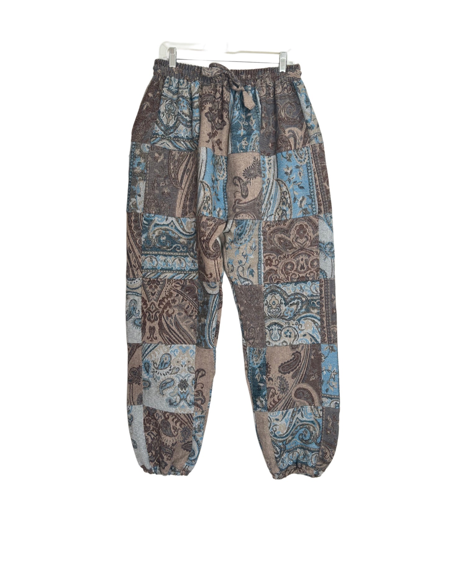 • Unisex patchwork harem pants made of thick fleece-like material.