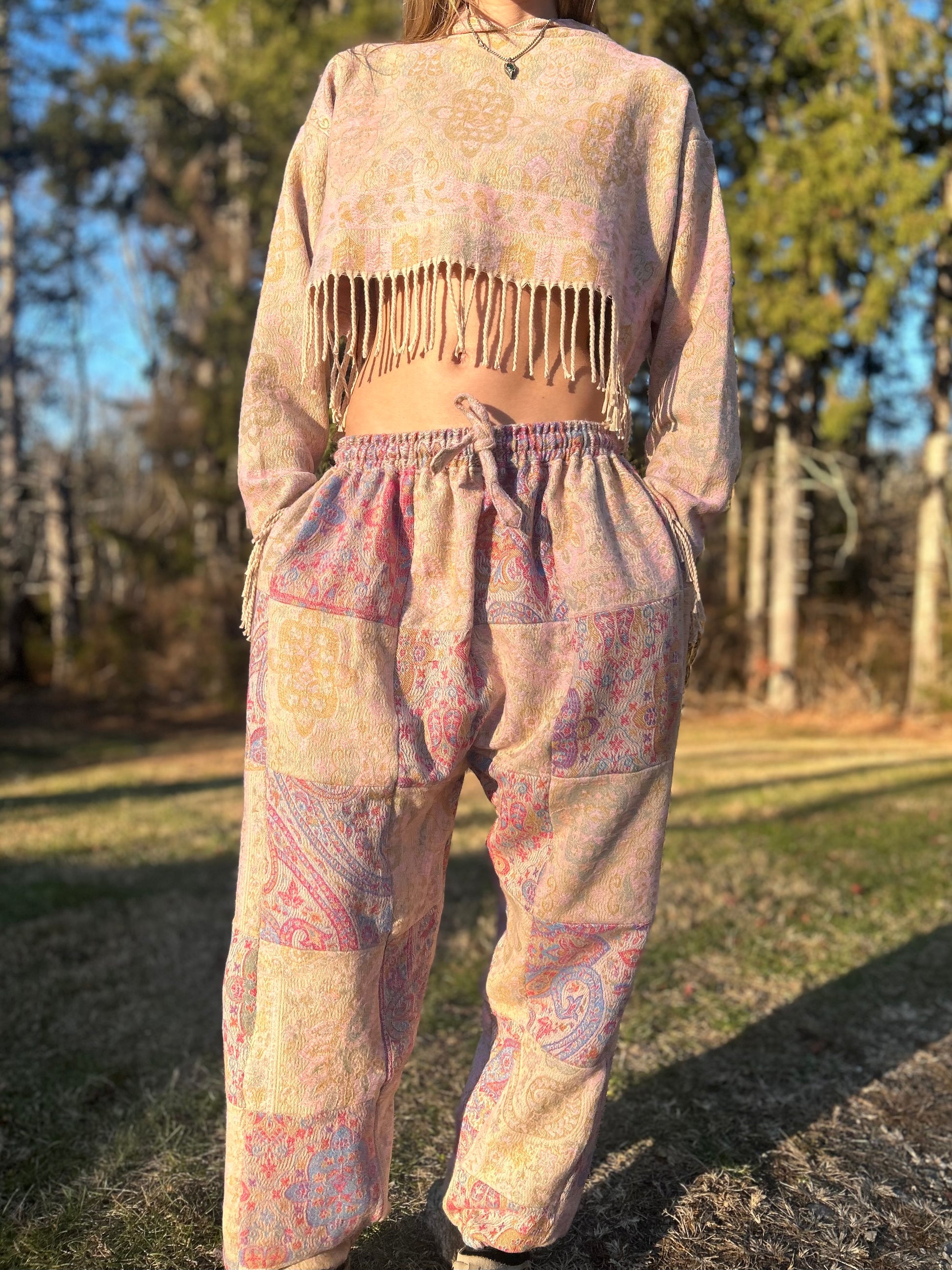 - Unisex patchwork harem pants made of thick fleece-like material.